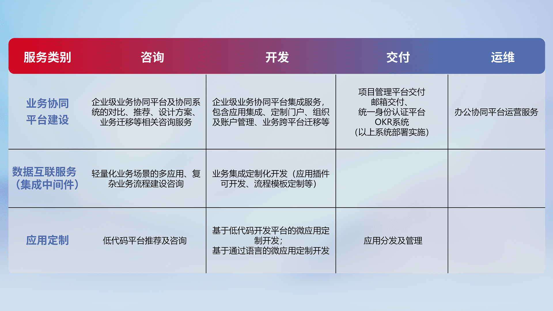 针对钉钉、、企微、、、、IDaas等平台级产品提供产品的规划、、、、方案、、、、交付、、、定制化开发等服务,,,,实现如统一协同办公、、、、智能客户服务、、、混合会议管理、、、智能数据查询、、、、等业务场景,,实现数字化转型。。。